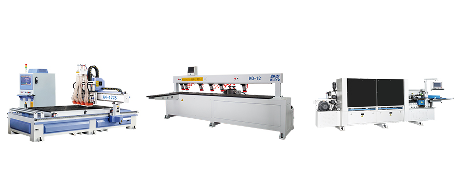 針對全屋定制廠,快克數控為您推薦的方案是:選擇四工序開料機/直排加工中心進行開料打孔,數控側孔機進行打側孔,全自動封邊機進行封邊,可根據自己的預算選擇合適自己的機型,適合投資資金有限,是具性價比的投資方案,如果規模大,生產效果要求高的廠家,可以配置帶自動上下料加自動貼標的直排加工中心,搭配數控六面鉆。封邊機可以配備高速封邊機或履帶封邊機。