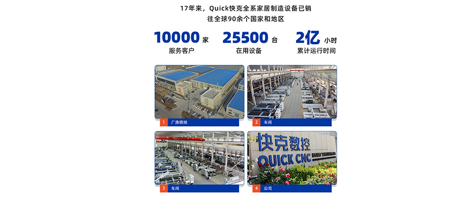 今天,快克數(shù)控作為定制家居制造業(yè)領(lǐng)先的生產(chǎn)解決方案供應(yīng)商,致力于家居智能制造CAD/CAM技術(shù)、CNC數(shù)控技術(shù)的研發(fā)與產(chǎn)業(yè)化應(yīng)用。已經(jīng)取得ISO9001:2000質(zhì)量管理體系及歐盟CE等多種認證。產(chǎn)品功能和品質(zhì)多年來屢獲殊榮,在業(yè)界廣受贊譽。 時間見證品質(zhì),公司秉承“用匠心鑄就品質(zhì) 以品質(zhì)成就耐用”的生產(chǎn)理念。17年來,Quick快克全系家居制造設(shè)備已銷往全球90余個國家和地區(qū),服務(wù)超10000家客戶,在用設(shè)備超25500臺,累計運行時間超200000000小時。